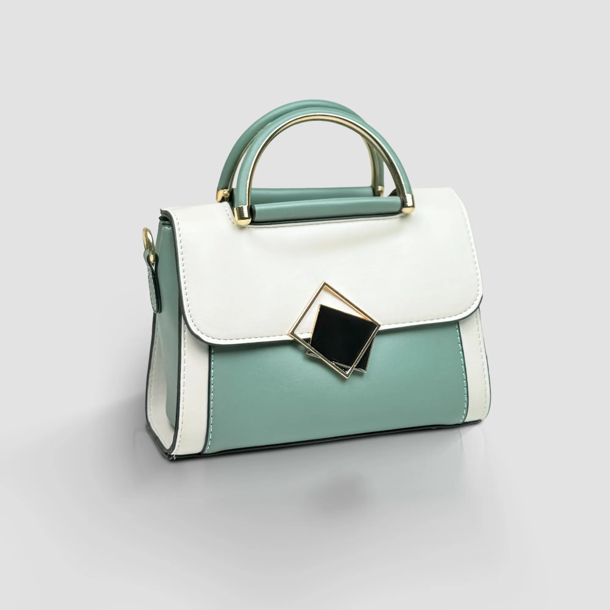Fresh and chic, the Mint & White Geometric Party Bag is perfect for standing out at any gathering. The soft mint panel contrasts beautifully with crisp white and is finished with a bold black-and-gold geometric clasp and matching gold top handle. Its compact design keeps it lightweight and easy to carry, making it an ideal accessory for parties, dinners, and special events.