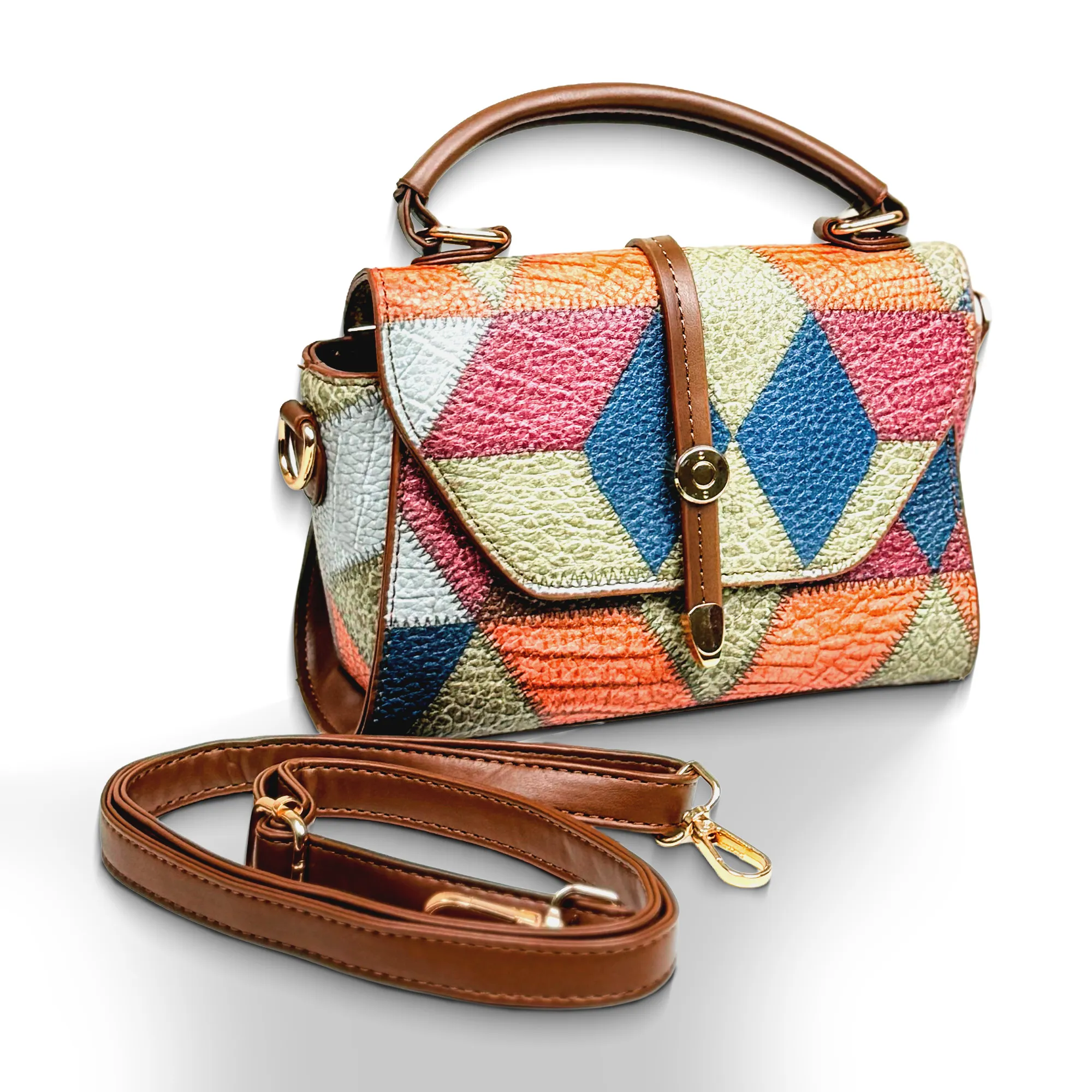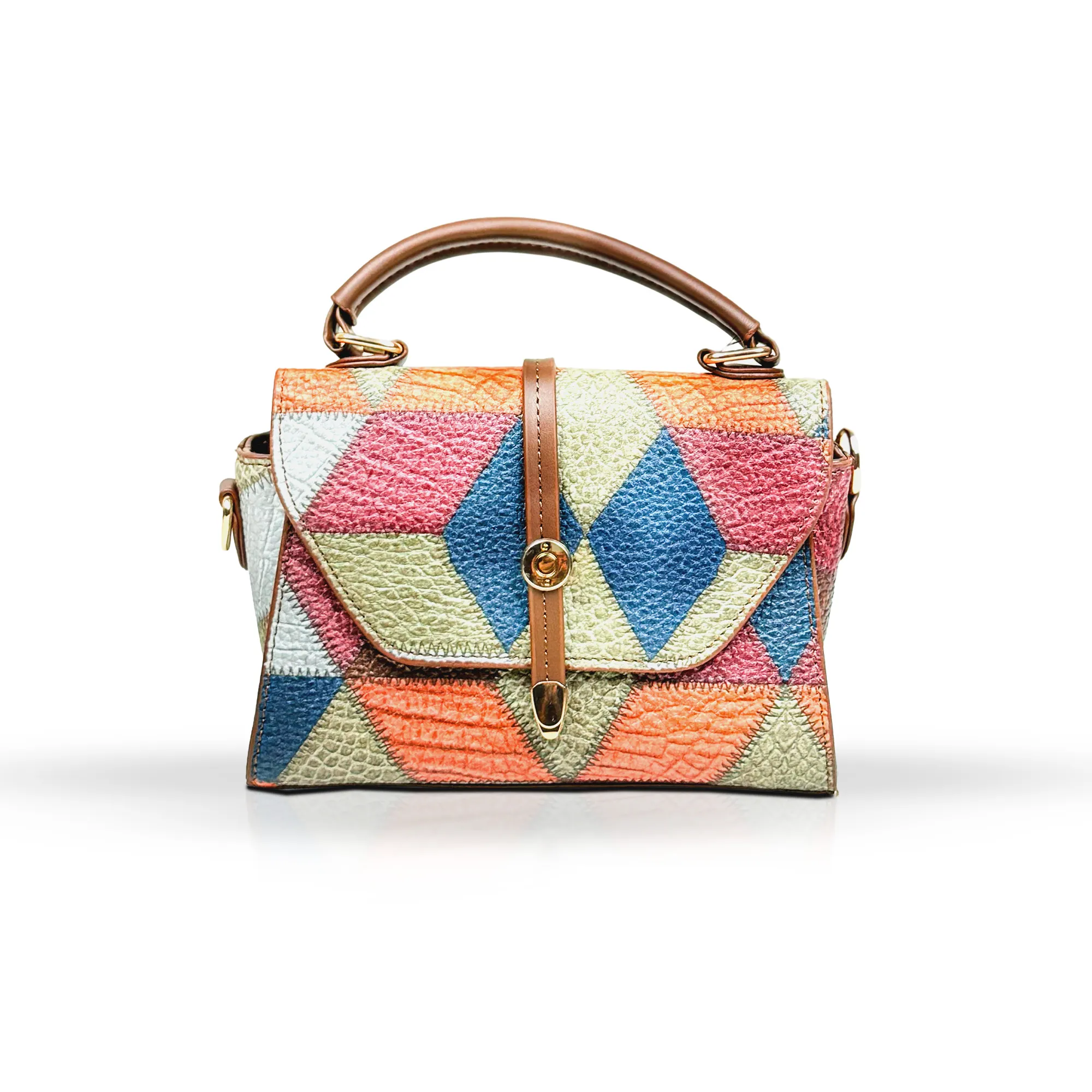 Brighten up your look with the Mosaic Mini Flap Satchel. This small yet striking bag features a colorful geometric design on textured PU leather, accented with smooth tan trims and a sleek center strap closure. Its compact, structured shape is perfect for carrying just the essentials while keeping your style bold and chic. Carry it by the top handle or attach a strap for hands-free crossbody wear.