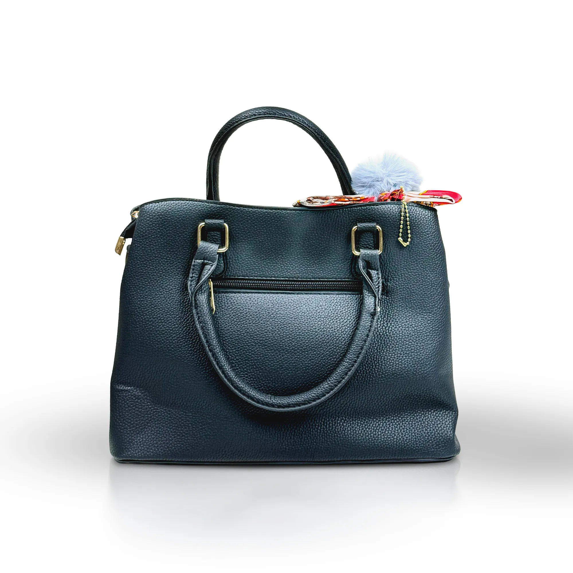 Classic meets playful in the Noir Scarf Accent Satchel. Made from pebbled PU leather, this structured black satchel is elevated with a detachable printed scarf and a soft grey pom-pom charm for a touch of personality. Its roomy interior and secure zip closure make it ideal for work, errands, and everything in between while keeping your look polished and chic.